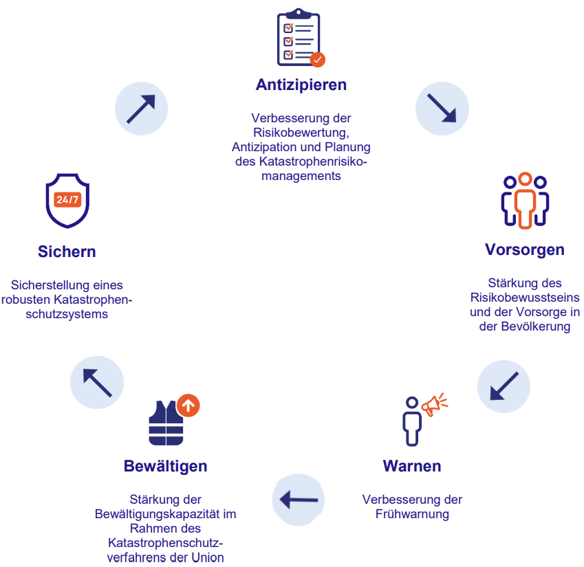 Die fünf Ziele wurden am 8. Februar 2023 von dem EU-Kommissar für Krisenmanagement, Janez Lenarčič, vorgestellt und bilden einen gemeinsamen Zyklus, der im Folgenden dargestellt ist: